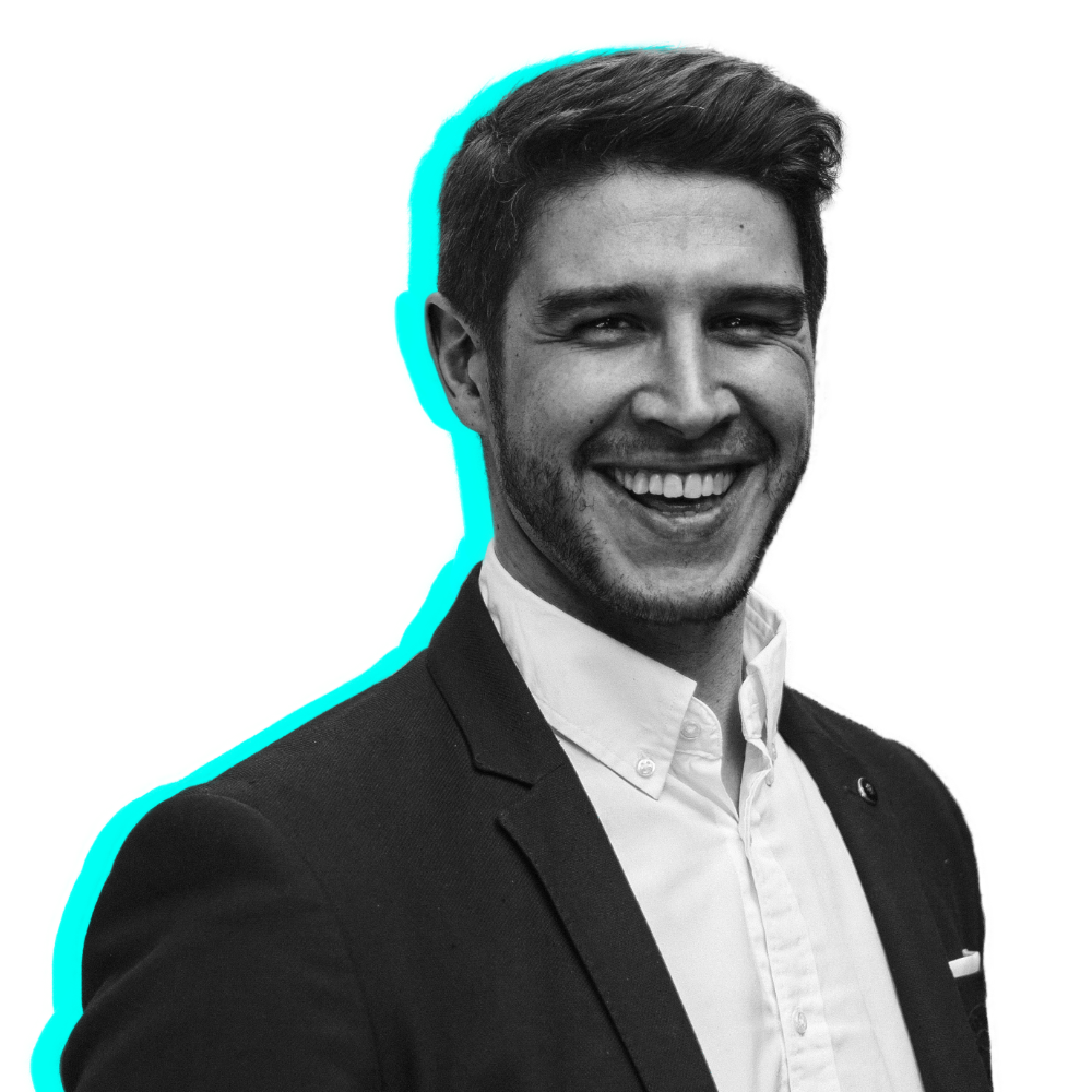 Caicy Sandford, CEO at Double Zero Media Group, in a black suit jacket and white shirt, smiling at the camera with a turquoise aberration outline.