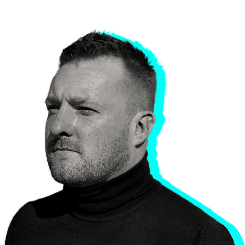 Black and white portrait of a Chris Canham wearing a black turtleneck. The background is black with a bright turquoise chromatic aberration around the right side.